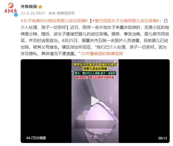 近日,網傳一名外地女子來重慶旅游時,在某小區的電梯里分娩,隨后,該女子直接把嬰兒扔進垃圾桶。據悉,事發當晚,嬰兒被市民發現,并及時送醫救治。8月25日,據重慶市五院一名醫護人員透露,目前嬰兒已經出院,被其父母接走。轄區派出所回應,“我們已介入處理,孩子一切安好。因為涉及隱私,具體情況不便透露。”