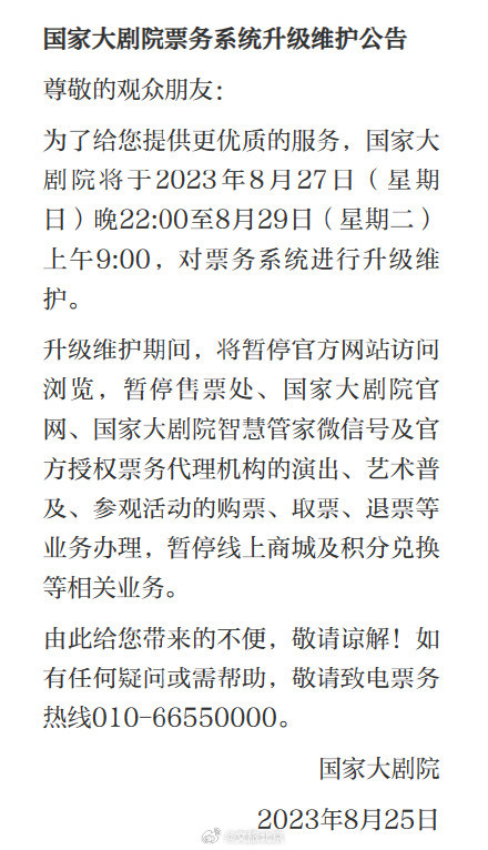 國家大劇院:這一時段票務系統升級維護,多項業務暫停