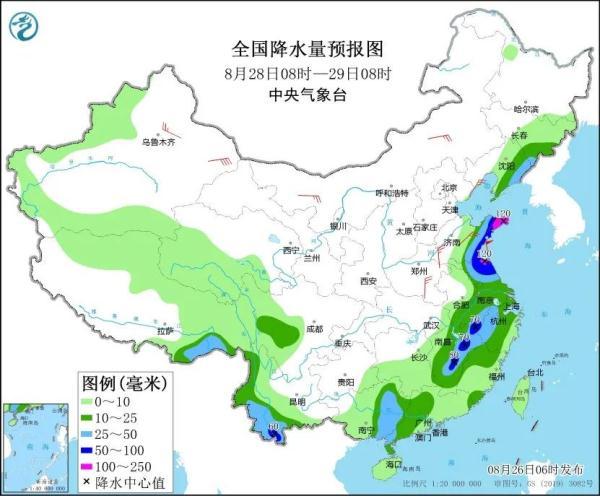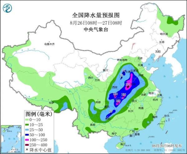 預計,8月26日14時至27日14時,重慶東部和北部、貴州中北部、陜西東南部、山西大部、湖北中西部、湖南西北部、河南、河北南部、安徽北部、山東西部等地有大到暴雨,其中,湖南西北部、湖北西部、河南中北部、河北西南部等地的部分地區(qū)有大暴雨,河南西南部局地特大暴雨(250~270毫米);上述部分地區(qū)伴有短時強降水(最大小時降雨量30~50毫米,局地可超過70毫米),局地有雷暴大風或冰雹等強對流天氣。
