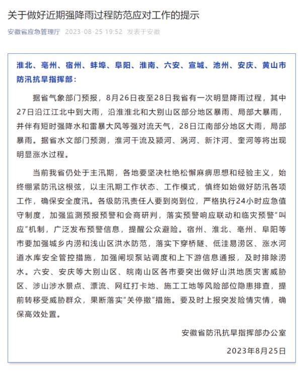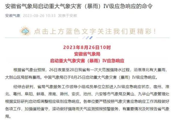 根據(jù)省氣象臺預報,26日夜里至28日我省有一次大范圍強降水過程,沿淮淮北有大暴雨,大別山區(qū)局部有暴雨。中國氣象局已于8月25日啟動重大氣象災害(暴雨)Ⅳ級應急響應。