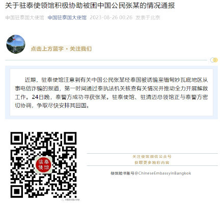 近期,駐泰使館注意到有關中國公民張某經泰國被誘騙至緬甸妙瓦底地區從事電信詐騙的報道,第一時間通過泰執法機關核查有關情況并推動全力開展解救工作。24日晚,泰警方成功尋獲張某。駐泰使館、駐清邁總領館正與泰警方密切協調,爭取盡快安排其回國。(中國駐泰國大使館微信公號)