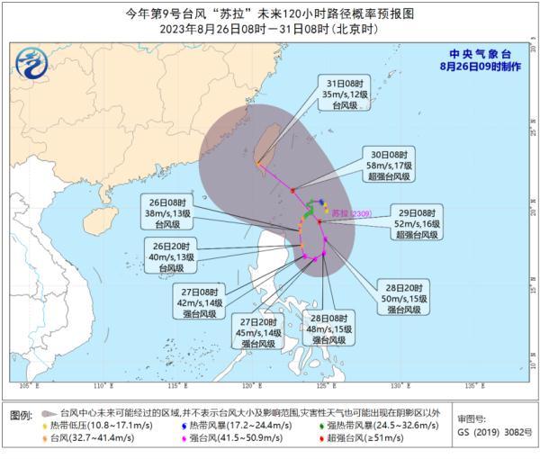 其中,臺風“蘇拉”未來三天仍將在菲律賓呂宋島東北部洋面徘徊,今8時其中心附近風力有13級(38米/秒,臺風級);預計29日起,“蘇拉”將轉向西北方向移動,逐漸向臺灣島東南部沿??拷?,強度逐漸增強,最強可達強臺風級或超強臺風級(48~58米/秒,15~17級),請華東及華南地區的公眾注意關注“蘇拉”的最新預報信息。