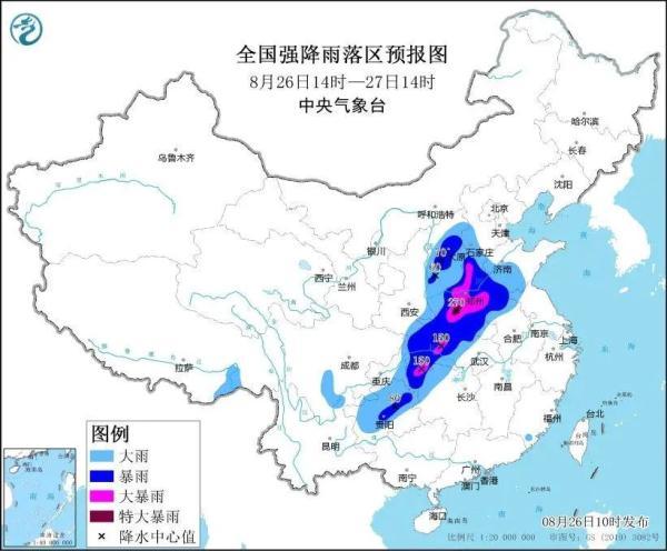 中央氣象臺8月26日10時繼續發布暴雨黃色預警:預計,8月26日14時至27日14時,重慶東部和北部、貴州中北部、陜西東南部、山西大部、湖北中西部、湖南西北部、河南、河北南部、安徽北部、山東西部等地有大到暴雨,其中,湖南西北部、湖北西部、河南中北部、河北西南部等地的部分地區有大暴雨,河南西南部局地特大暴雨(250至270毫米);上述部分地區伴有短時強降水(最大小時降雨量30至50毫米,局地可超過70毫米),局地有雷暴大風或冰雹等強對流天氣。