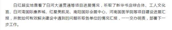5月17日,南陽市常務(wù)副市長白紅超到南陽市城鄉(xiāng)一體化示范區(qū)調(diào)研重點(diǎn)項(xiàng)目建設(shè),新聞中提到:“白紅超實(shí)地查看了各項(xiàng)目進(jìn)展情況,聽取了河南國醫(yī)學(xué)院等項(xiàng)目建設(shè)進(jìn)展匯報(bào)。”