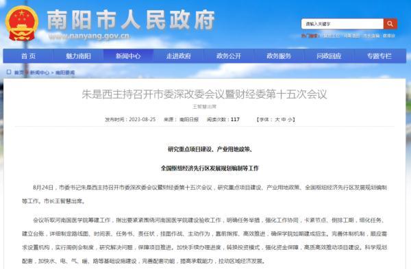 8月24日,南陽市召開市委深改委會(huì)議暨財(cái)經(jīng)委第十五次會(huì)議,研究重點(diǎn)項(xiàng)目建設(shè)、產(chǎn)業(yè)用地政策、全國樞紐經(jīng)濟(jì)先行區(qū)發(fā)展規(guī)劃編制等工作。會(huì)議聽取河南國醫(yī)學(xué)院籌建工作。