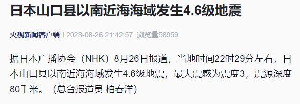 據央視新聞客戶端援引日本廣播協會(NHK)8月26日報道,當地時間22時29分左右,日本山口縣以南近海海域發生4.6級地震,最大震感為震度3,震源深度80千米。