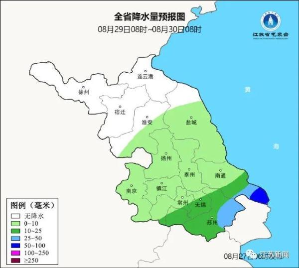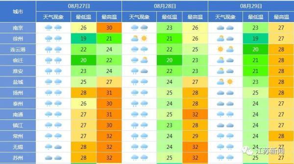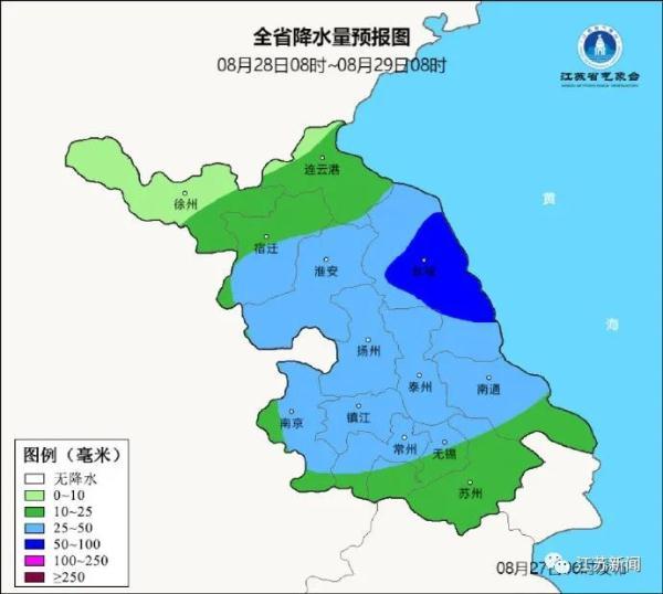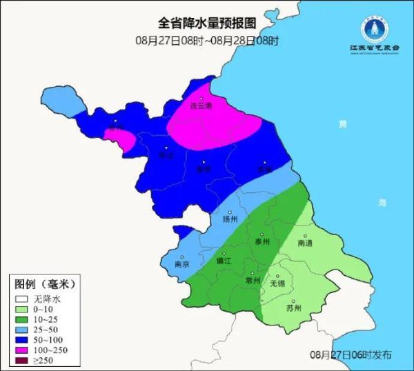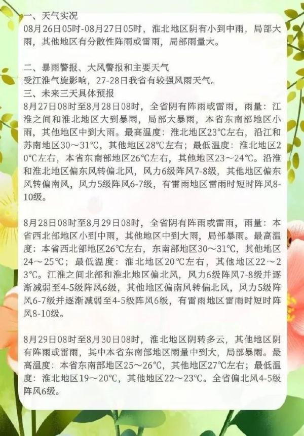8月27日8時至8月28日8時,江蘇陰有陣雨或雷雨,雨量:江淮之間和淮北地區大到暴雨,局部大暴雨,本省東南部地區小雨,其他地區中到大雨。