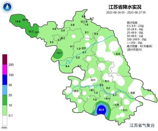 26日05時-27日05時,無錫、淮安、徐州等8個市的114個鄉鎮(街道)的降水量達到10mm以上(占全省7.05%),其中無錫、淮安2個市的3個鄉鎮(街道)的降水量達到50mm以上。