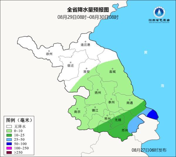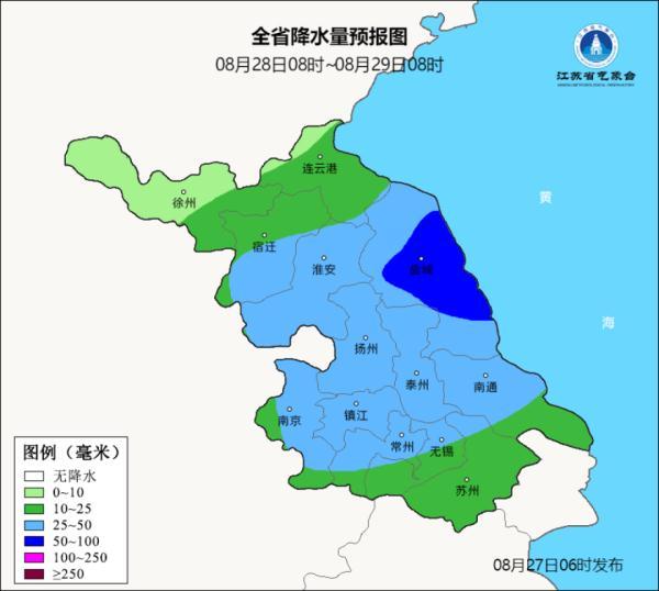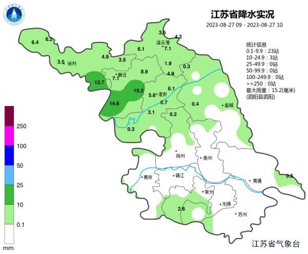 27日09時-27日10時,南通、連云港、徐州、宿遷、鹽城、淮安、揚州、常州、泰州、無錫、南京11個市的650個鄉鎮(街道)的降水量達到0.1毫米以上(占全省35.4%);連云港、徐州、宿遷、南通、淮安5個市的81個鄉鎮(街道)的降水量達到10毫米以上(占全省4.4%);宿遷1個市的1個鄉鎮(街道)的降水量達到25毫米以上(占全省0.1%);前三位分別是宿遷泗洪孫園鎮28.5毫米、宿遷泗洪洪澤農場23.6毫米、宿遷泗陽來安街道八集社區21.2毫米。