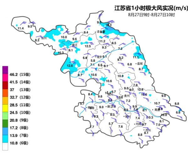 27日09時-27日10時,連云港、淮安、徐州、鹽城、宿遷、南京6個市的34個鄉鎮(街道)的極大風達到7級以上(占全省1.9%);連云港、鹽城2個市的9個鄉鎮(街道)的極大風達到8級以上(占全省0.5%);前三位分別是連云港灌云開山島19.2m/s(8級,27日09時37分)、連云港連云區高公島街道黃窩村18.4m/s(8級,27日09時52分)、連云港市連云區西連島18.3m/s(8級,27日09時27分)。