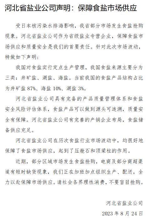 8月25日,河北省市場監管局召開由各市市場監管部門和25家食鹽生產企業、批發企業參加的食鹽監管工作座談會。會議要求各相關企業落實食品安全主體責任,把保障食鹽價格穩定和質量安全作為首要責任,切實維護食鹽市場秩序,保障人民群眾食鹽消費安全。會議部署各級市場監管部門加大監督檢查和執法力度,嚴厲打擊食鹽價格和質量違法行為。