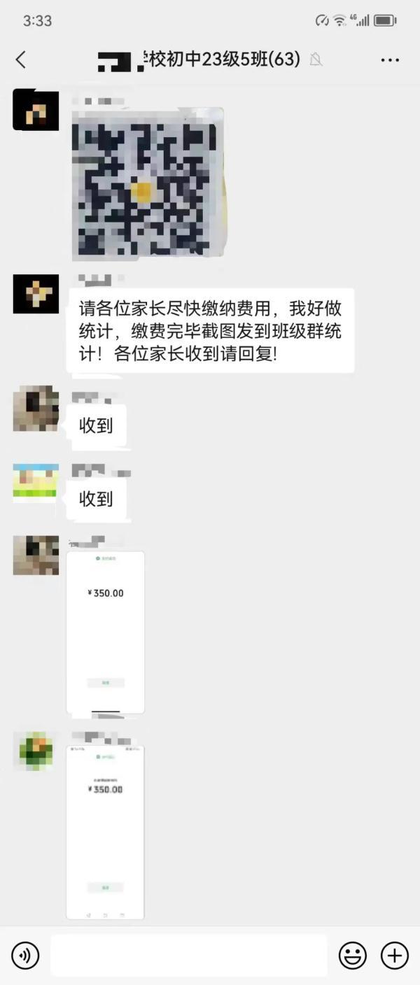 “學校統(tǒng)一財務(wù)二維碼繳費,收到的家長請現(xiàn)在掃碼繳費后將圖發(fā)到群里……”
