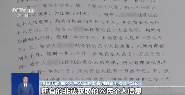 廣東省佛山市南海區人民法院刑事審判庭審判員鐘綺文介紹,以侵犯公民個人信息罪判處被告人陳某等人9個月至3年8個月不等的有期徒刑并處罰金,同時判定被告人陳某等人支付共計56萬余元的侵害社會公共利益賠償金,并要求他們自行徹底刪除所有的非法獲取的公民個人信息,并在國家級以上的媒體進行道歉。