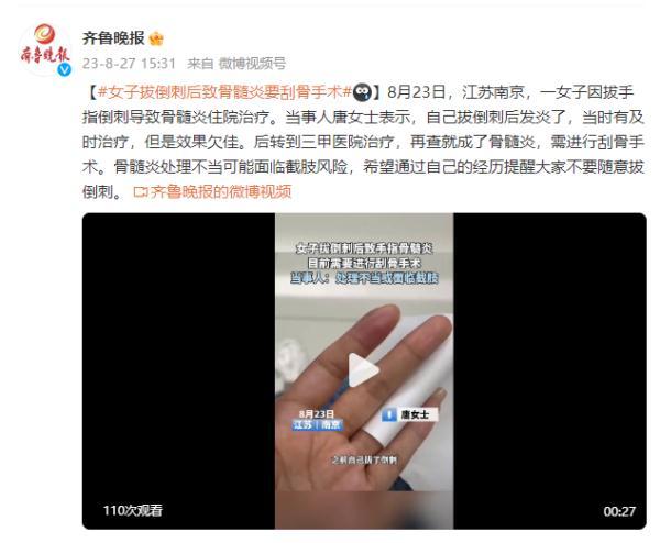 8月23日,江蘇南京,一女子因拔手指倒刺導致骨髓炎住院治療。當事人唐女士表示,自己拔倒刺后發炎了,當時有及時治療,但是效果欠佳。后轉到三甲醫院治療,再查就成了骨髓炎,需進行刮骨手術。骨髓炎處理不當可能面臨截肢風險,希望通過自己的經歷提醒大家不要隨意拔倒刺。