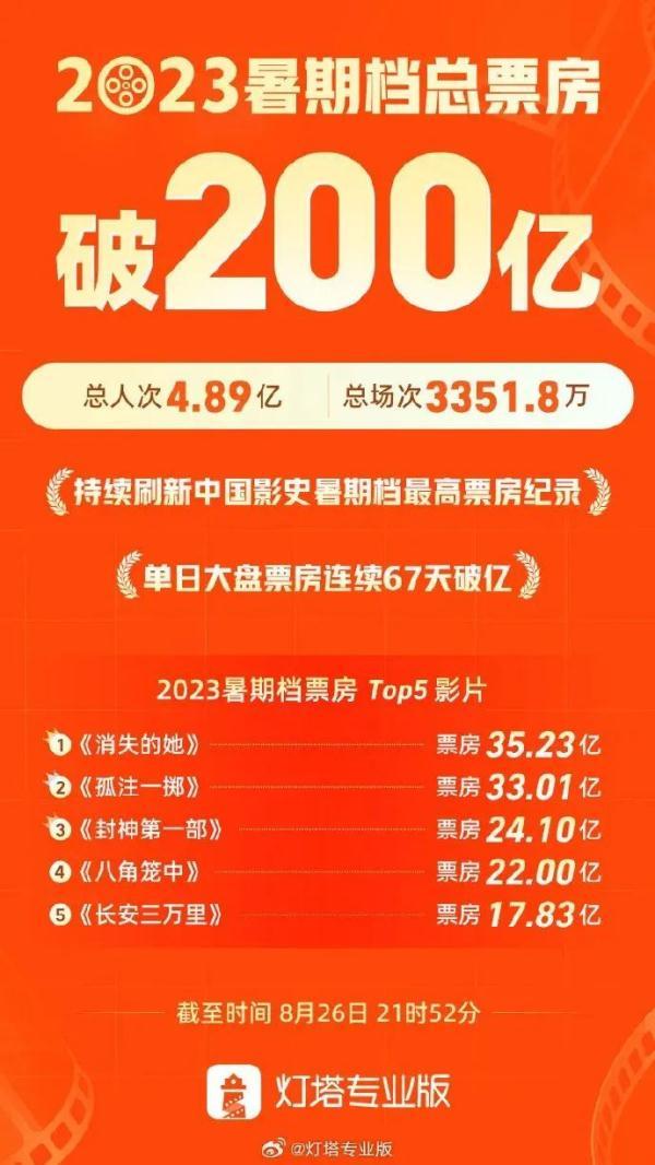 據(jù)燈塔專業(yè)版,截至8月26日21時(shí)52分,2023年暑期檔(6月1日-8月31日)總票房(含預(yù)售)首次突破200億,持續(xù)刷新中國(guó)影史暑期檔最高票房紀(jì)錄。