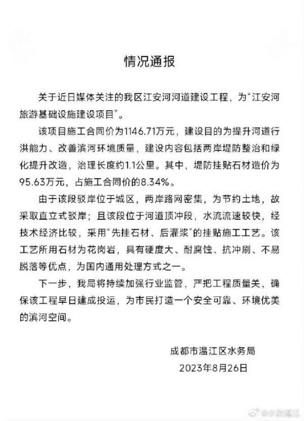 26日,成都市溫江區(qū)水務(wù)局發(fā)布情況通報(bào)稱,近日媒體關(guān)注的溫江區(qū)江安河河道建設(shè)工程,為“江安河旅游基礎(chǔ)設(shè)施建設(shè)項(xiàng)目”。該項(xiàng)目施工合同價(jià)為1146.71萬元,建設(shè)目的為提升河道行洪能力、改善濱河環(huán)境質(zhì)量,建設(shè)內(nèi)容包括兩岸堤防整治和綠化提升改造,治理長(zhǎng)度約1.1公里。其中,堤防掛貼石材造價(jià)為95.63萬元,占施工合同價(jià)的8.34%。