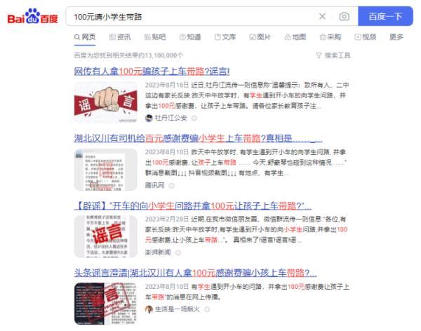 當打開瀏覽器搜索“100元請小學生帶路”時,出現了13100000條搜索結果,這類消息早在2016年就在全國各地傳播。