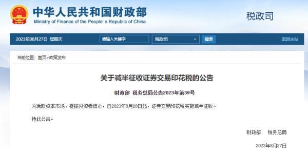 8月27日,財政部網(wǎng)站發(fā)布《關(guān)于減半征收證券交易印花稅的公告》,原文如下: