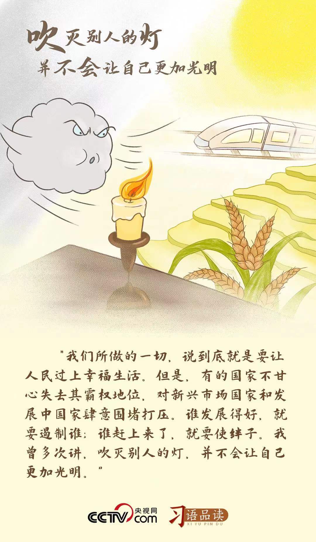 “吹滅別人的燈,并不會讓自己更加光明”這句話,淺顯易懂地闡明了一個樸素的道理,即通過打壓別人,并不能使自己變得更加強大,同時也揭示了只有團結合作、共享機遇,才能走共贏之路,才能讓發展成果惠及各國人民的普遍真理。