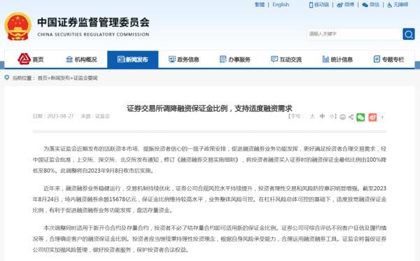 為落實(shí)證監(jiān)會(huì)近期發(fā)布的活躍資本市場(chǎng)、提振投資者信心的一攬子政策安排,促進(jìn)融資融券業(yè)務(wù)功能發(fā)揮,更好滿足投資者合理交易需求,經(jīng)中國(guó)證監(jiān)會(huì)批準(zhǔn),上交所、深交所、北交所發(fā)布通知,修訂《融資融券交易實(shí)施細(xì)則》,將投資者融資買(mǎi)入證券時(shí)的融資保證金最低比例由100%降低至80%。此調(diào)整將自2023年9月8日收市后實(shí)施。