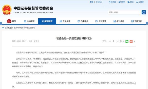 證監(jiān)會(huì)進(jìn)一步規(guī)范股份減持行為
