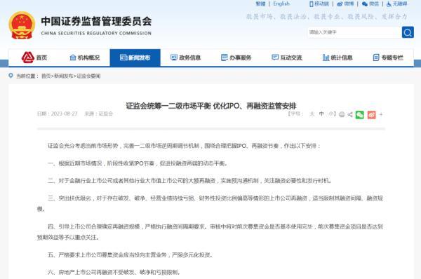 8月27日,證監(jiān)會(huì)網(wǎng)站發(fā)布《證監(jiān)會(huì)統(tǒng)籌一二級(jí)市場(chǎng)平衡優(yōu)化IPO、再融資監(jiān)管安排》、《證監(jiān)會(huì)進(jìn)一步規(guī)范股份減持行為》和《證券交易所調(diào)降融資保證金比例,支持適度融資需求》。