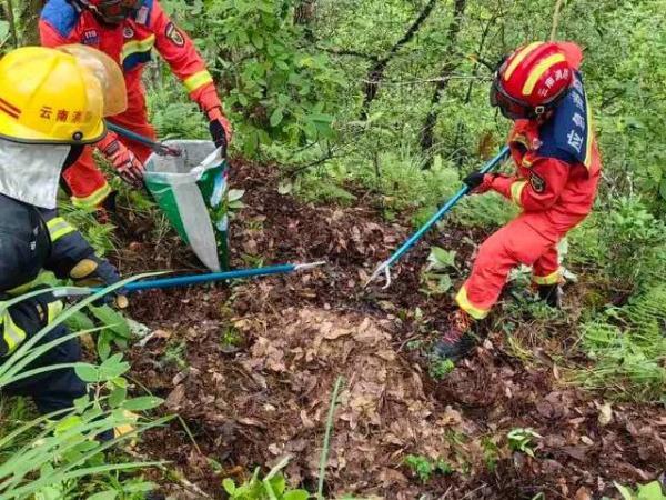 13時30分,消防救援人員到達現場。經詢問專職消防隊員及周邊群眾得知,該蛇已多次在附近居民家中出現,并在村邊筑窩安家。一村民在去務農路上看到蛇盤踞在山坡的草堆上,不敢貿然處置,只能請消防隊員前來處置。隨后現場指揮員立即帶領隊員前往現場進行偵查,發現該眼鏡王蛇正盤踞在山坡處的蛇窩里休息,且該蛇窩所在山腳就有居民居住,不遠處還有學校、趕集市場,如不及時處置,后果不堪設想。