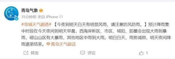 據(jù)@青島天氣的消息,預(yù)計(jì)降雨集中時(shí)段在今天夜間到明天早晨,西海岸新區(qū)、市區(qū)、城陽、即墨會(huì)出現(xiàn)大雨到暴雨,嶗山山區(qū)有大暴雨,其他地區(qū)中雨到大雨。明白白天,雨勢(shì)減弱,明天夜間降雨逐漸結(jié)束。