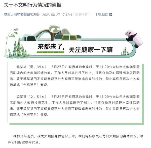 韓某某(男,39歲),8月26日在熊貓基地參觀時,于14:20分向幼年大熊貓別墅活動場內(nèi)的大熊貓投喂竹筍。工作人員對其進行了制止,并將雜物及時清理出室外活動場。鑒于韓某某的不文明參觀及對大熊貓可能造成危害的行為,禁止其終身再次進入熊貓基地(含熊貓谷)參觀。