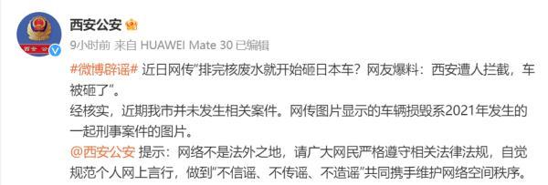 西安公安微博消息,近日網傳“排完核廢水就開始砸日本車?網友爆料:西安遭人攔截,車被砸了”。