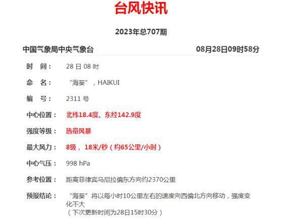 今年第11號臺風“海葵”已于今天(8月28日)上午生成,目前其中心位于距離菲律賓馬尼拉偏東方向約2370公里的海面上,“海葵”將以每小時10公里左右的速度向西偏北方向移動,強度變化不大。截至目前,西北太平洋上有“蘇拉”“達維”“海葵”三個臺風同時活躍,形成“三臺共舞”。