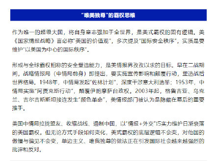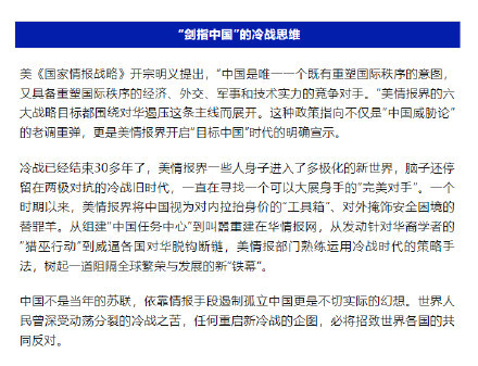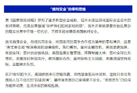 8月10日,美國2023年《國家情報戰略》正式發布。這個戰略情報中的遏華用心昭然若揭,折射出“美式安全觀”在面對當前復雜安全形勢時的歇斯底里。戳圖看寄生于美國國家安全戰略中不合時宜的四種危險思維。(國家安全部)