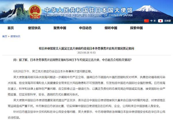 據(jù)中國駐日本國大使館網(wǎng)站28日消息,駐日本使館發(fā)言人就吳江浩大使應(yīng)約會(huì)見日本外務(wù)事務(wù)次官有關(guān)情況答記者問。
