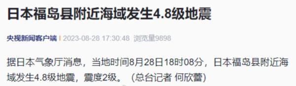 據日本氣象廳消息,當地時間8月28日18時08分,日本福島縣附近海域發生4.8級 地震,震度2級。