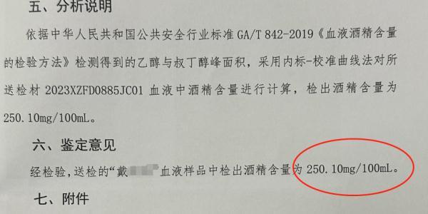 隨后戴某經(jīng)抽血檢測(cè),血液中酒精含量為250.10mg/100ml,達(dá)到醉駕標(biāo)準(zhǔn)。