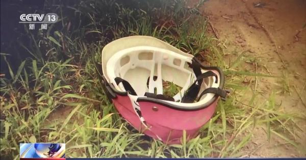 事故現場照片顯示,這頂頭盔沒有緩沖層,撞擊過后,頭盔殼體破了一個大洞,佩戴裝置也被甩脫。