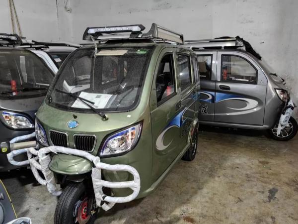 這兩輛車都是三輪燃油車。一輛是白洋淀BYD50QZK車型,售價(jià)8000元,四周沒(méi)有遮蔽,而且需要跨坐在座位上。另外一輛雖然是全封閉的,售價(jià)1萬(wàn)5千元,但車內(nèi)空間狹窄。