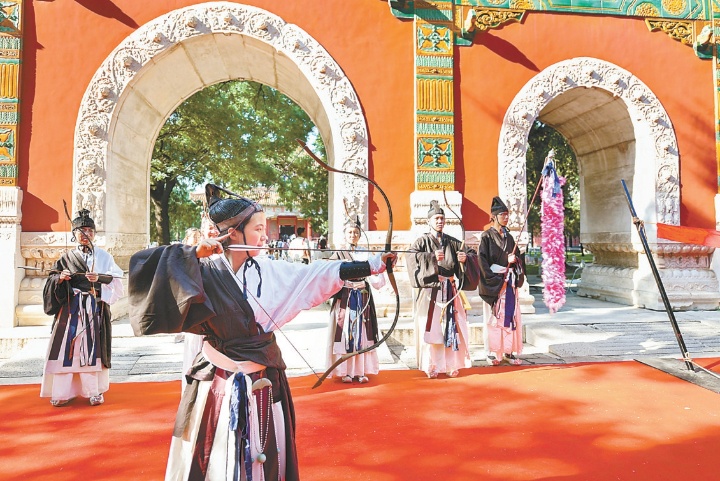 28日,在孔廟和國(guó)子監(jiān)博物館,2023東城文化月暨第九屆北京孔廟國(guó)子監(jiān)國(guó)學(xué)文化節(jié)開幕,現(xiàn)場(chǎng)進(jìn)行了周代鄉(xiāng)射禮復(fù)原展示。東城文化月舉辦期間,大學(xué)生國(guó)學(xué)文化交流會(huì)、古建音樂(lè)季、博物館之夜等30項(xiàng)精彩活動(dòng)持續(xù)開展,活動(dòng)將持續(xù)至9月28日。