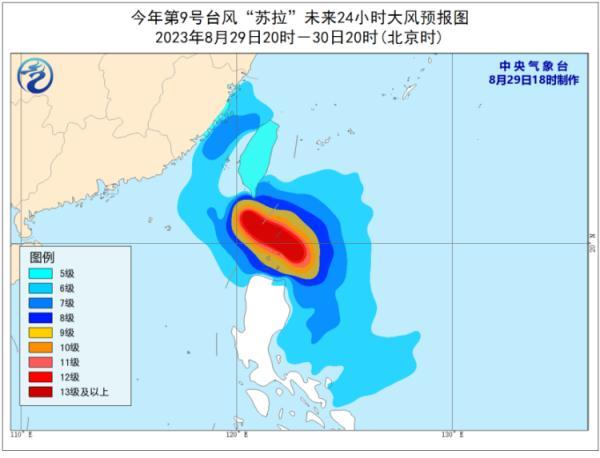 大風預報:8月29日20時至30日20時,巴士海峽、臺灣海峽、臺灣以東洋面偏南海域、南海東北部的部分海域、福建沿海、臺灣島東南部沿海將有6-8級、陣風9-10級的大風,其中巴士海峽海域風力可達9-10級,部分海域風力可達11-13級,“蘇拉”中心經過的附近海面的風力有14-16級、陣風17級及以上,請過往船只注意航行安全。