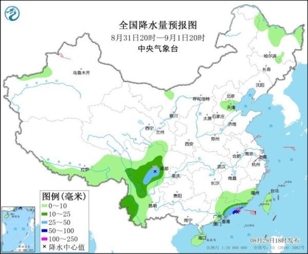 8月31日20時(shí)至9月1日20時(shí),四川西南部、云南北部和西部、福建南部、廣東東部等地的部分地區(qū)有中到大雨,其中,廣東東部沿海的部分地區(qū)有暴雨或大暴雨(100~180毫米)。內(nèi)蒙古中部、遼東半島、浙江、福建和廣東東部沿海等地有4~6級(jí)風(fēng)。