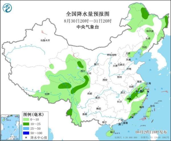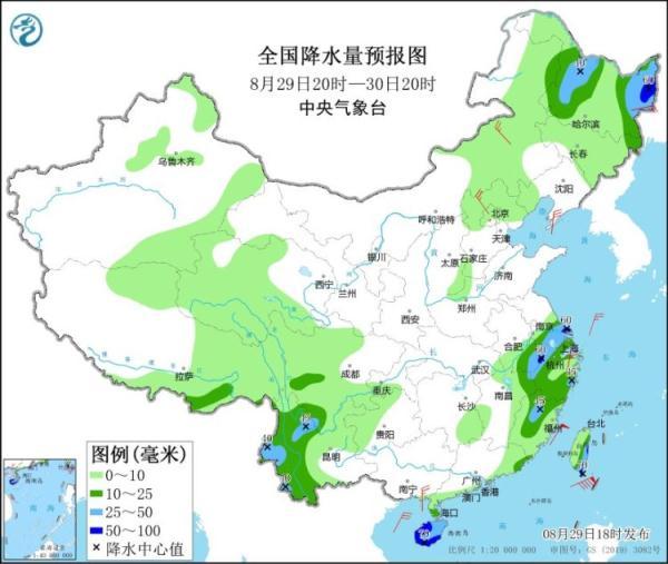 8月29日20時(shí)至30日20時(shí),黑龍江東部和西部、四川西南部、云南中西部、蘇皖南部、上海、浙江大部、福建中北部、海南島、臺(tái)灣島等地的部分地區(qū)有中到大雨,其中,黑龍江東部、江蘇南部、安徽南部、浙江北部、海南島西部和南部、臺(tái)灣島東部和南部等地局地有暴雨(50~70毫米)。內(nèi)蒙古中東部、黑龍江東部、遼東半島、河北北部、浙江東部、廣西東南部沿海等地的部分地區(qū)有4~6級(jí)風(fēng)(見圖2)。