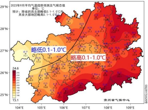 預計9月全省平均氣溫14.5℃~25.5℃,與常年同期相比,除畢節市大部、六盤水市北部和遵義市西部略低0.1~1.0℃外,其余大部地區略高0.1~1.0℃;全省降水量60~180毫米,與常年同期相比,除遵義市大部、畢節市、六盤水市北部、貴陽市西北部偏多1~3成外,其余地區偏少1~3成。9月主要有4次降溫降水過程,大致出現在9月上旬后期(強度偏弱)、9月中旬中期(強度中等)、9月中旬末期至下旬初期(強度中等)、9月下旬后期(強度偏弱)。