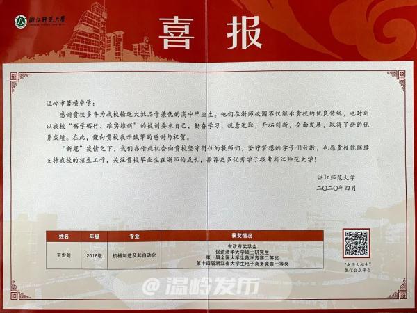 高中時,他拿下數學競賽省一等獎、習思英語二等獎;被浙江師范大學錄取后,他更“一發(fā)不可收拾”,GPA(平均績點)高達4.0,連續(xù)3年智育、綜合排名專業(yè)排名第一,三次獲得浙江省政府獎學金,獲得第十屆全國大學生數學競賽二等獎、第十四屆浙江省大學生電子商務競賽一等獎,以公費推薦第一名的資格到臺灣交流一學期,參加國家級大學生創(chuàng)業(yè)項目1項、創(chuàng)新項目1項、浙江省“新苗”人才計劃1項,發(fā)表論文2篇,申請專利多項,并先后獲得美國多所大學的全額獎學金offer,復旦、浙大、中國科學院和清華碩士offer,最終以優(yōu)異的成績被保送清華大學碩士研究生,在清華大學學習期間,多次拿到碩士研究生國家獎學金……