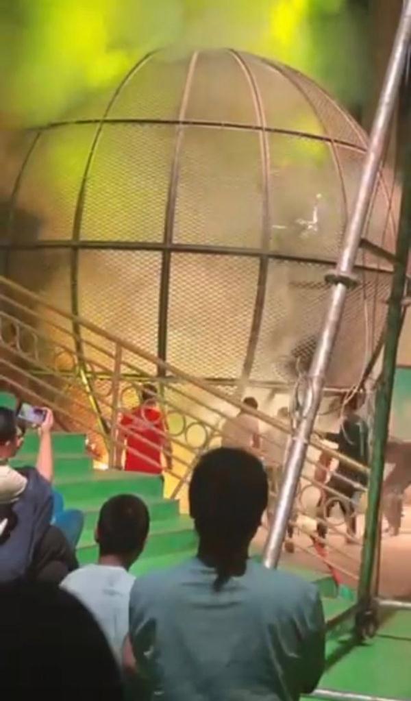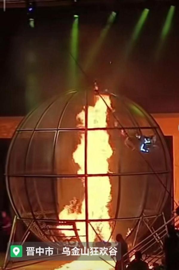視頻中,兩名表演者騎著摩托車在一個球狀裝置內部表演,兩輛摩托車后還冒著閃閃火星,刺激的表演引得觀眾陣陣驚呼。然而,其中一名表演者疑似撞到了哪里突然墜落,球狀裝置內立即起火,火勢升騰,另一名表演者只能騎著摩托車繞著火躲避,現場受到驚嚇的觀眾發出驚呼。表演裝置外的工作人員立即拿來滅火器,很快將火撲滅。另有網友拍攝的視頻顯示,火勢被撲滅后,一位表演者躺在地上,有人為其解除身上的裝備。