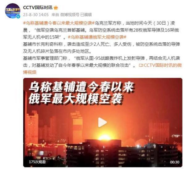 烏克蘭軍方稱,當地時間今天(30日)凌晨,“俄軍空襲烏克蘭首都基輔。烏軍防空系統擊落所有28枚俄軍導彈及16架俄軍無人機中的15架”。