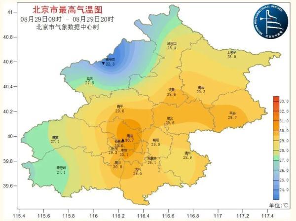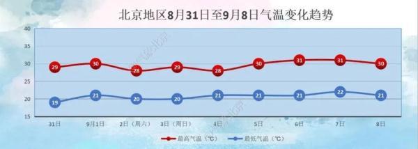 預計南郊觀象臺從8月31日到9月8日最高氣溫28~31℃,最低氣溫19~22℃。