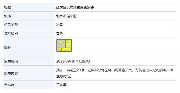 冰雹黃色預警:預計,當前至20時,延慶部分地區將出現冰雹天氣,可能造成一定的損失,請注意防范。