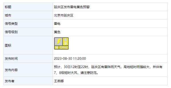 北京市氣象局消息,8月30日,北京延慶區連續發布雷電黃色預警、大風藍色預警和冰雹黃色預警。雷電黃色預警:預計,30日12時至22時,延慶區有雷陣雨天氣,局地短時雨強較大,并伴有7、8級短時大風,請注意防范。