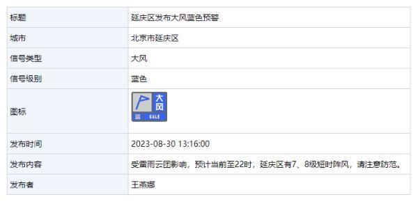 大風藍色預警:受雷雨云團影響,預計當前至22時,延慶區有7、8級短時陣風,請注意防范。