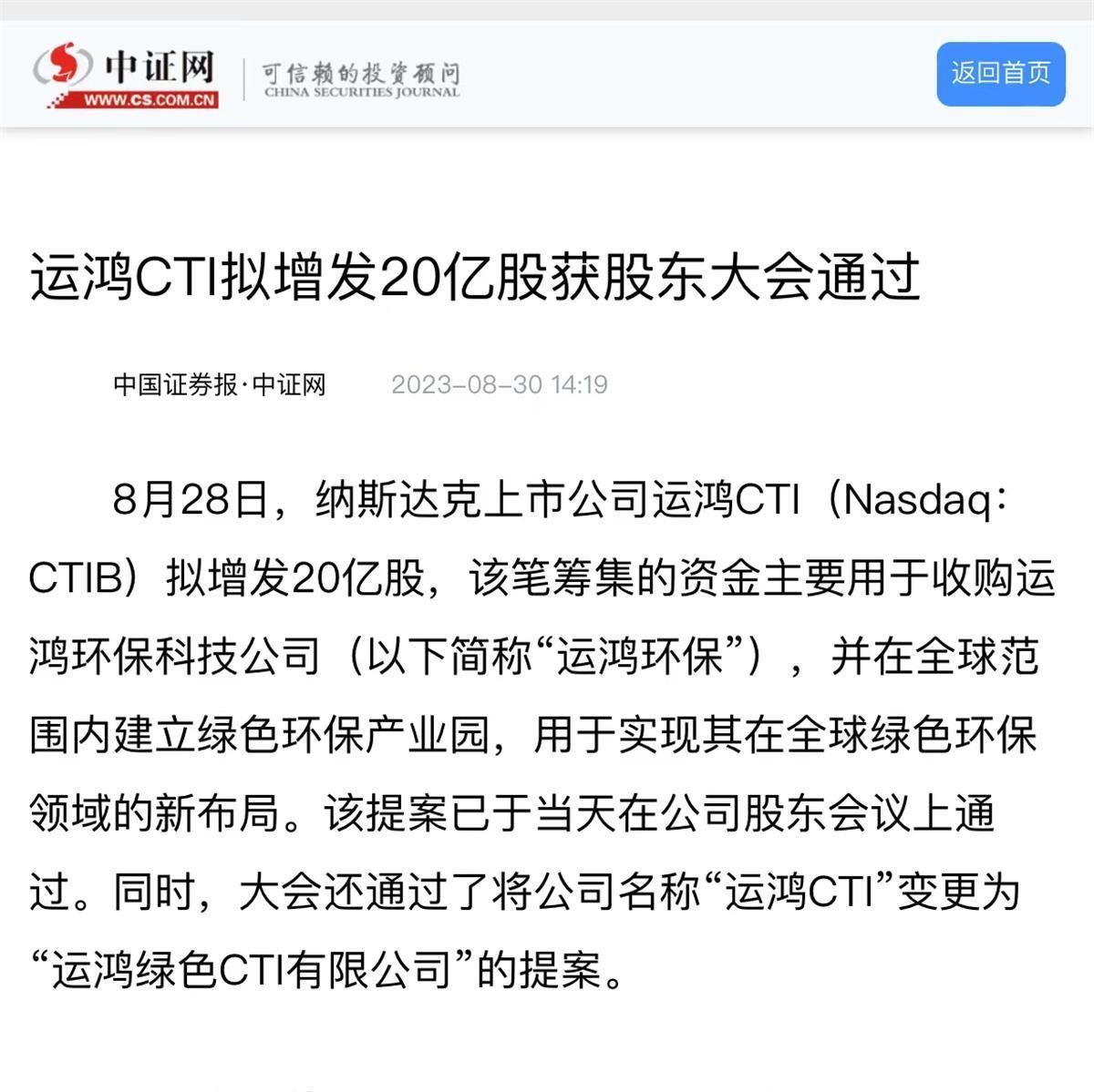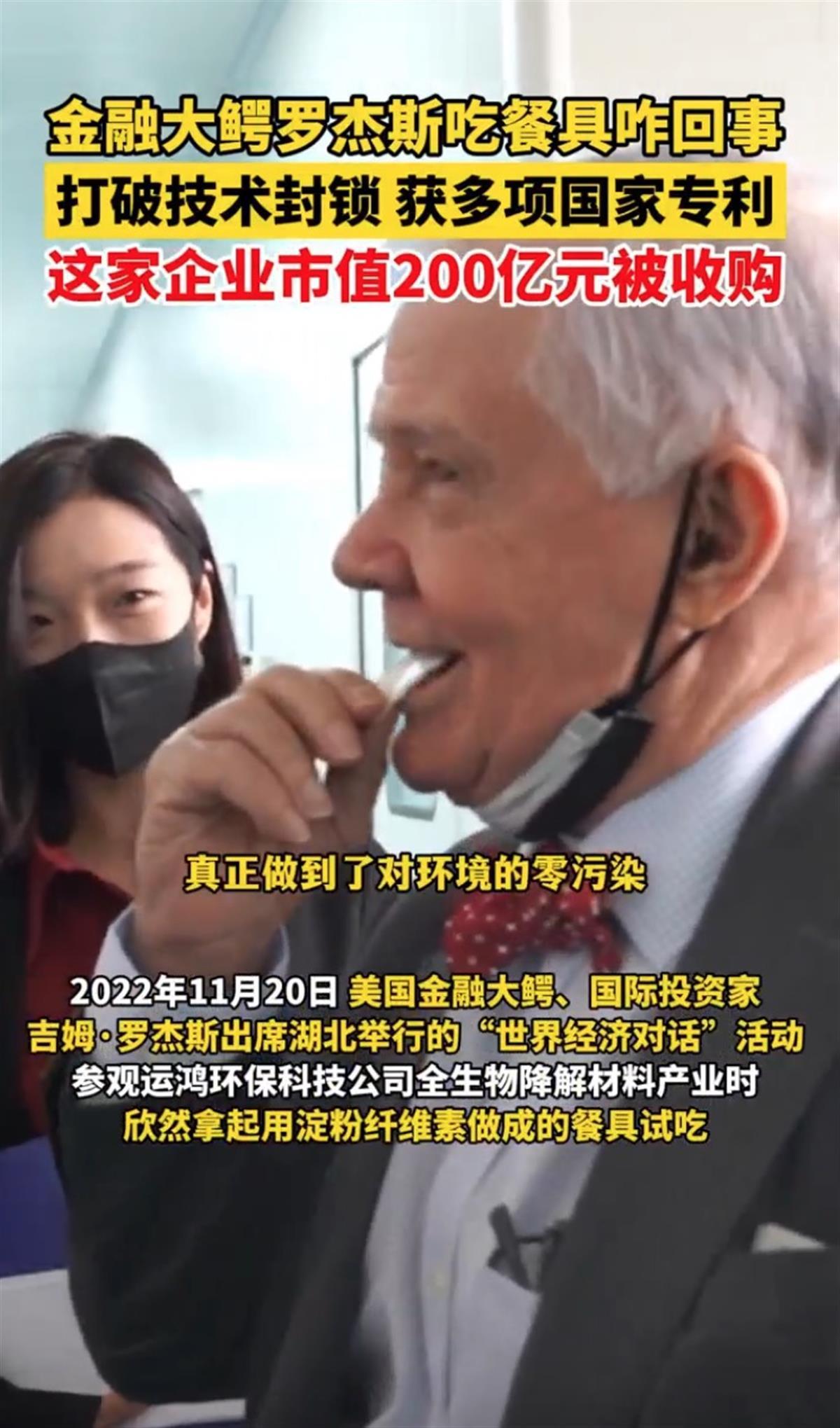 視頻影像資料顯示,2022年11月20日,美國金融巨頭、國際投資家吉姆·羅杰斯出席在湖北舉行的“世界經濟對話”活動,參觀湖北武穴的運鴻環保科技公司全生物降解材料產業項目時,欣然拿起用淀粉纖維素做成的餐具試吃,為該公司的全降解生物技術叫好!而在9個月后,即2023年8月28日,納斯達克上市公司運鴻CTI(Nasdaq:CTIB)公告,擬增發20億股收購運鴻環保科技公司。